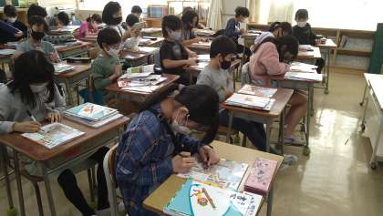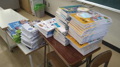 このように15冊もの教科書が配布されました。「ぶあつい!」「重たい!」「おもしろそう!」と言いながら、中を見たり、丁寧に名前を書いたりしました。5年生の学習が楽しみですね!