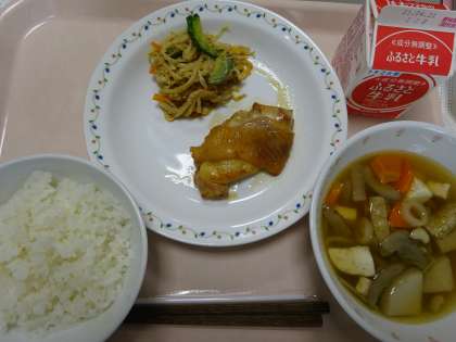 本日の献立 ごはん 牛乳 鶏の照り焼き けんちん汁 ごま酢かけ