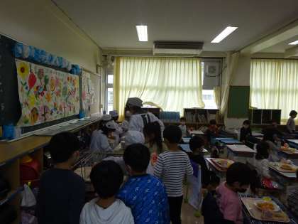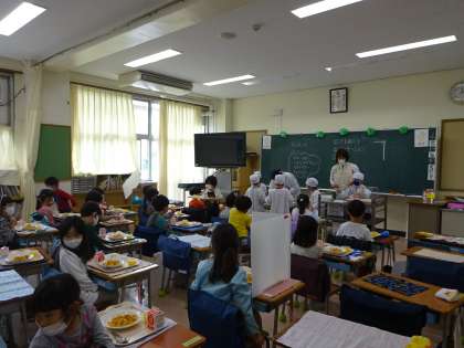 1年生の給食が始まりました。きまりや約束を守って、給食準備をしたり、おいしく食べたりできました。給食準備と片付けには、地域にお住まいの方が「小1サポーター」としてお手伝いしてくださいます。