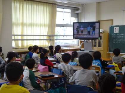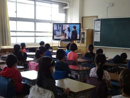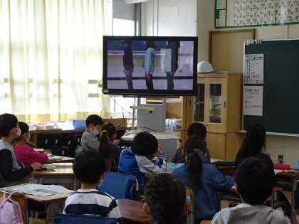 テレビ放送で体育委員会が「気を付け 休め 前へならい」の基本的な動きを教えてくれました。どのクラスも真剣に視聴していました。放送後は拍手をする温かい姿が見られました。