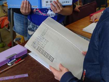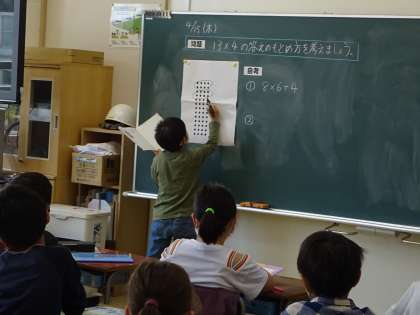 既習事項をもとにして、13×4の計算の仕方を考えました。ペアになって自分の考えを友達に説明したり、黒板で図を示しながら全体に説明したりする3年生の姿が見られました。答えは一つでもいろいろな考え方ができる楽しさを味わっていました。