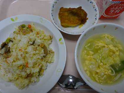 本日の献立 三色ピラフ 牛乳 鶏肉のカレー焼き 卵と野菜のスープ