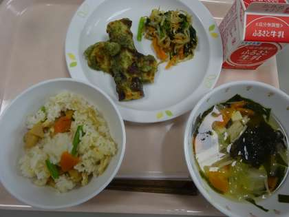 本日の献立 たけのこごはん 牛乳 ちくわの磯辺揚げ 豆腐汁 野菜のごまだれかけ