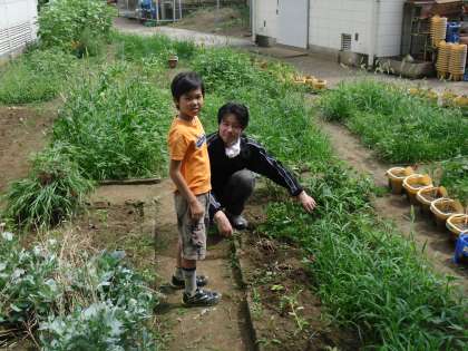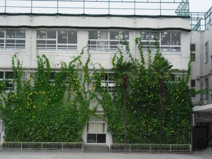 ヘチマ、キュウリ、ゴーヤが写真の通り大きく育ち屋上まで届く高さになりました。学級園では担任が大汗をかいて除草作業をしていました。