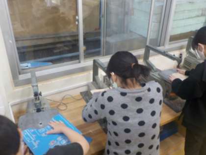 第一回目は安全な使い方を確かめて、板を切る練習を重ねました。