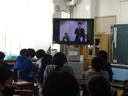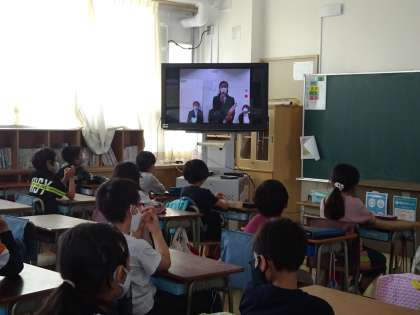 今日の5時間目は離任式をテレビ放送で行いました。大好きな先生との再会に喜びでいっぱいの子どもたちでした。去られた先生方から、今の生活や学校の様子をお話していただきました。
