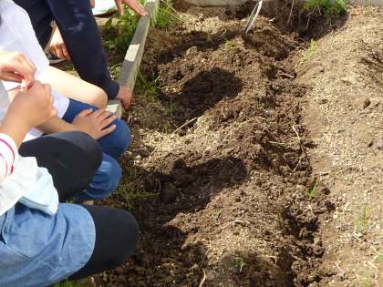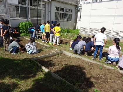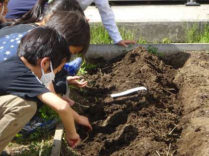 2年生は、自分の鉢にミニトマトのタネをまきました。畑には、畝をつくって、オクラやヒマワリのタネをまきました。これから毎日お世話をしていきます。