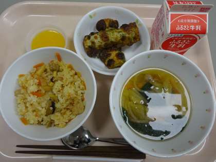 中華おこわ 牛乳 ちくわの磯辺揚げ 中華スープ フルーツゼリー