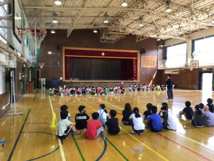 今日は学年合同で体育館に集まり、運動会のオリエンテーションを行いました。使う曲を聞いたり、イメージを確認したりして、楽しみを膨らませました。