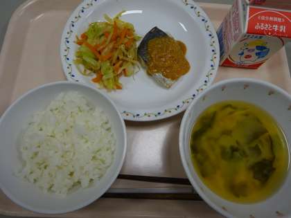 本日の献立 ごはん 牛乳 魚のピリ辛ソースかけ キャベツともやしのおかかかけ