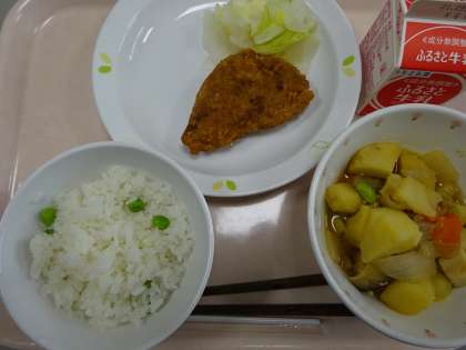 本日の献立 グリンピースごはん 牛乳 新じゃがのそぼろ煮 魚の立田あげ