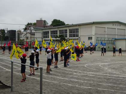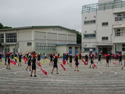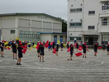 フラッグをもって踊ります。今日は、黒Tシャツをもって来られた人は黒Tシャツも着て踊ってみました。日に日に上手になっています。隊形移動の練習もしました。