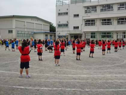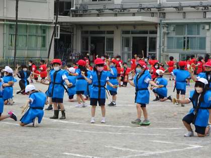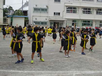 運動会の踊りの練習に励んでいる子どもたち。今日は衣装を着て、「よつたけ」を両手に持って鳴らして練習をしました。真剣に踊る子どもたち。腕をおもいっきり伸ばすのは大変だけど、踊りは楽しい!!と笑顔の子どもたちでした。