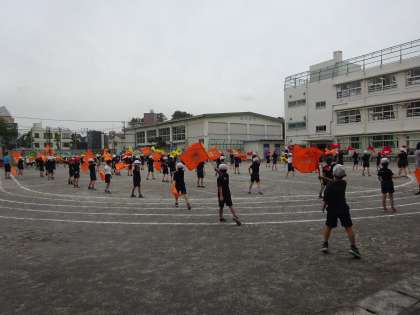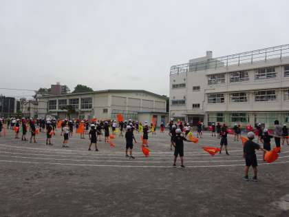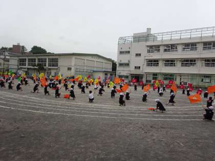 衣装を着て、フラッグを持って、3,4年生が合同で練習をしました。全員そろって校庭いっぱいに広がり、迫力があります。