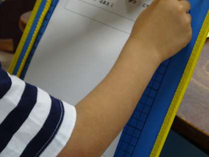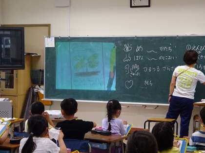 朝顔の芽が出ました。観察のポイントを教室で学習した後、裏庭に置いてある鉢のところへ行って観察しました。