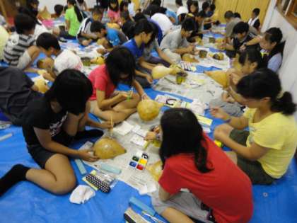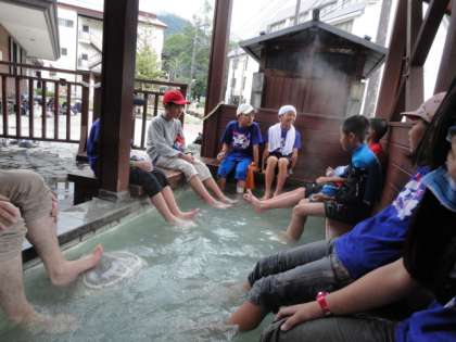 足元の良くない中でのウォークラリー、貴重な体験になりました。そして、源泉体験、あんよの湯。足に伝わる温もりがとても心地よいものでした。夜はふくべ細工。11月の展覧会に出す予定です。