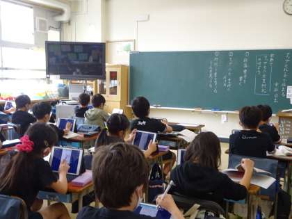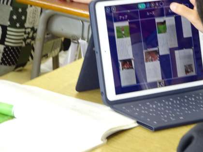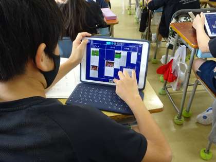 4年生の国語、説明的な文章の学習です。対比的に説明されている内容をとらえ、段落どうしの関係を確かめながら読んでいます。iPadを活用し、ロイロノートで先生から送られた教材文を対比してまとめていきました。