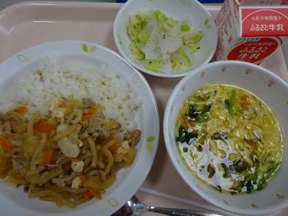 本日の献立 豚丼 牛乳 大根とキャベツのゆかりかけ かきたま汁