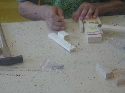 図工の時間に金槌の使い方を学習しています。木切れを組み合わせてくぎを打ち、作品を仕上げました。金槌の使い方等の基礎・基本を習得し、その習得過程で作品が生まれています。