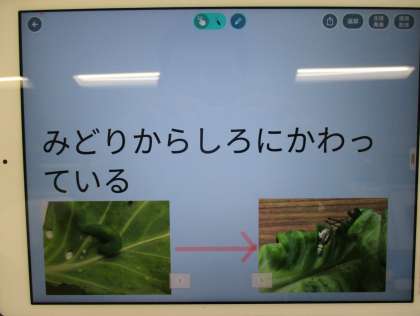 また、理科のモンシロチョウの観察でも、写真や動画を何度も繰り返し見たり、拡大して細かい部分まで観察したり、いくつかの写真を並べて見比べたりと、それぞれが関心をもったところを自由に調べていました。