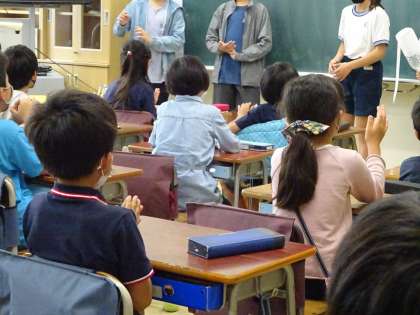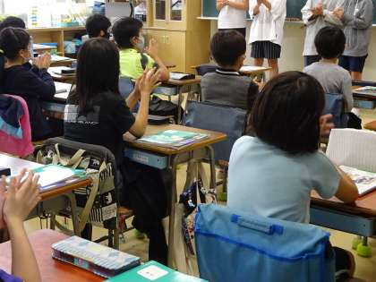 今年の運動会係は6年生のみです。応援団もその一つ。ただし、声は出せないので、手拍子などを工夫して応援します。応援団の児童は、休み時間には各学級に出向き、今年の応援の仕方を教えています。