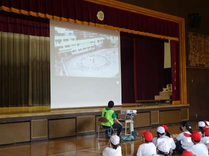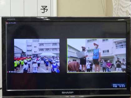 子どもたちは、体育館や教室で、ライブ配信で観戦しました。定点カメラだけではなく、トラック内外での撮影への切り替えもあり、迫力ある映像を楽しめました。