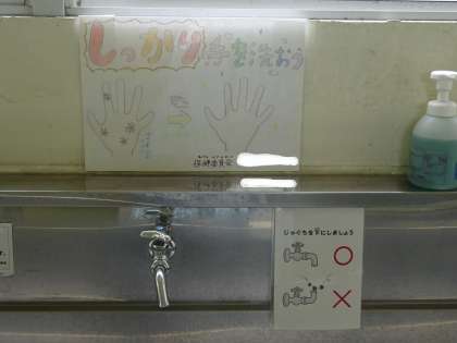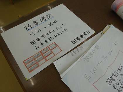 写真は、読書週間の案内をつくった図書委員会、手洗いの注意喚起の表示をつくった保健委員会、よりよい学校をめざして全校に呼びかける事項を考えている代表委員会です。