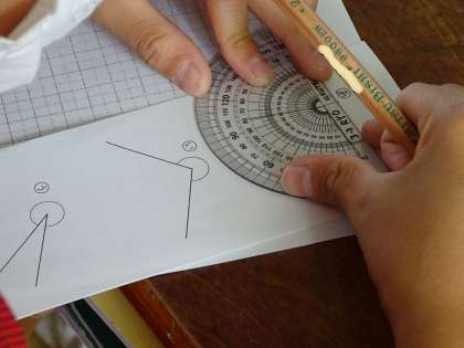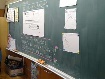 4年生では「角」の学習をしています。今日は、180度よりも大きい角度を分度器を使って測りました。どのように測ったらいいか、「180度にたす方法」と「360度から引く方法」を考え、そのどちらかの方法で角度を測りました。