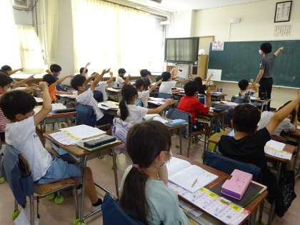 2年生の3時間目は、1組は算数、2組と3組は国語でした。1,2時間目に体力・運動能力調査を終えた2年生ですが、3時間目が始まるとどの子も学習課題に向けて一生懸命に取り組む姿が見られました。写真は、左から1組の算数「長さ」、2組の国語「新出漢字の学習」、3組「スイミー」の様子です。