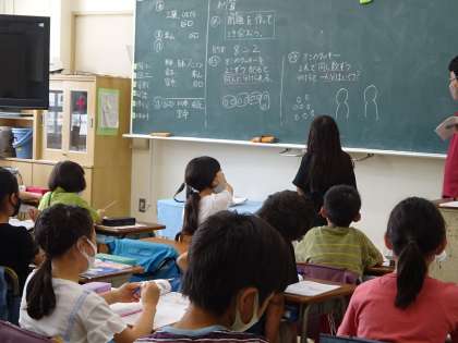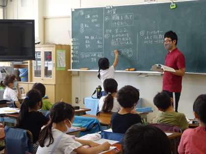3年生はわり算の学習を進めています。1つのコースの今日の算数では、「8個のクッキーを2個ずつ配ると何人に分けられるかな」「8個のクッキーを2人で同じ数ずつ分けると一人分は何個かな」という包含除と等分除の違いを考えて問題を作り解き合いました。