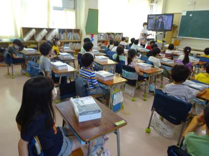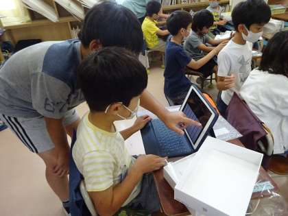 先日全校朝会でiPad貸与式を行いましたが、今日は1年生の教室で一人ずつ貸与されました。そして、6年生が1年生にいろいろと教えてあげました。