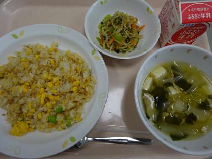 本日の献立 三色丼 牛乳 野菜のごまだれかけ 豆腐汁