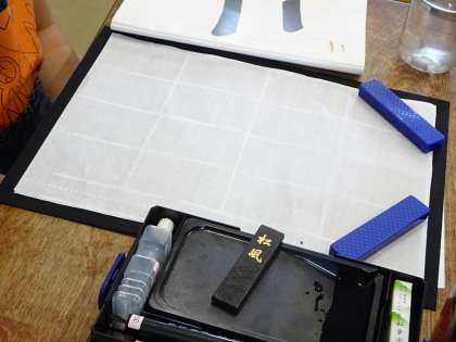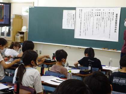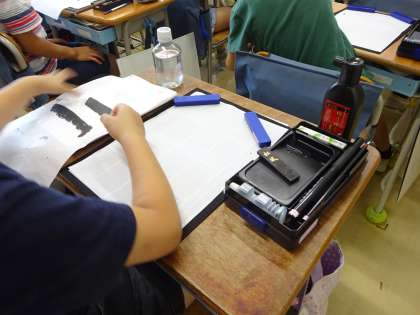 3年生から始まった毛筆の学習。用意から片付けまで、一つ一つ丁寧に取り組んでいます。筆の穂先を左ななめ上、45度で入れて「二」を書きました。