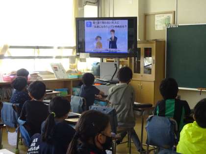 4年生のセーフティ教室では、「スマホや携帯」の安全な利用について学びました。ビデオ教材を使って、スマホや携帯を使う場合の心がけやSNSの危険性について考えました。ご家庭でもトラブルに巻き込まれないように話題にしていただきたいと思います。