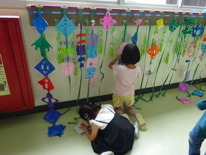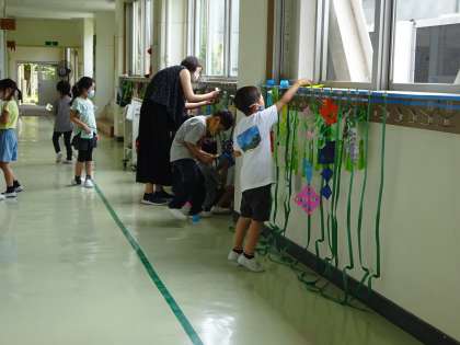 1年生の図工で紙を折ったり、切ったりしてできる模様を見つけて、考えて飾りをつくりました。