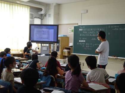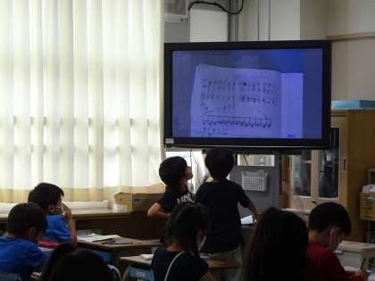 わり算の学習を進めています。自分の考えをもつことを大切に指導しています。ノートに書いた自分の考えを拡大してテレビに映し、みんなに説明しました。