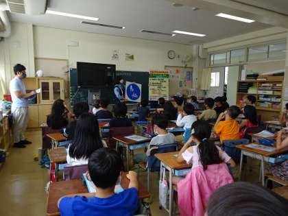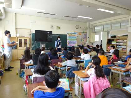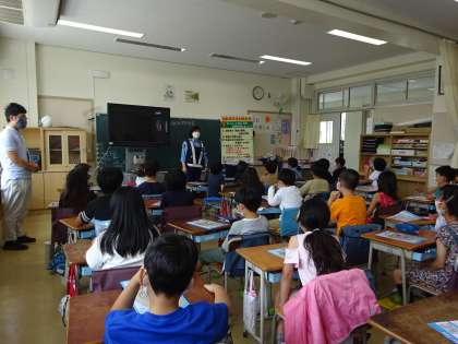 感染症予防のため、今年も世田谷警察署のお巡りさんによる教室での学習となりました。自転車に正しく乗るためのルールや気を付けることを学びました。自転車に乗るときは、ヘルメットをかぶりましょう。