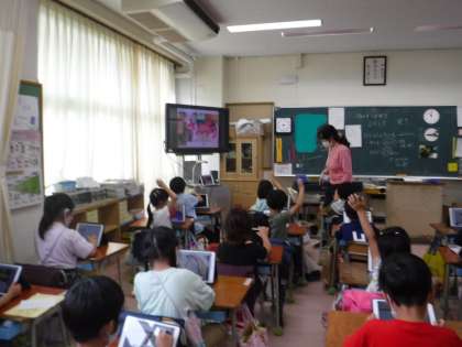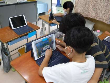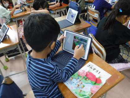 2組、3組は昨日、1組は今日、iPadを使って学習しました。学校のいろいろなところの写真を撮って、撮った写真に文字や絵を描き込んで保存するという基本操作を学びました。