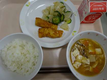 本日の献立 ごはん 牛乳 いかのかりんとあげ 麻婆汁 大根ときゅうりのごま風味