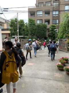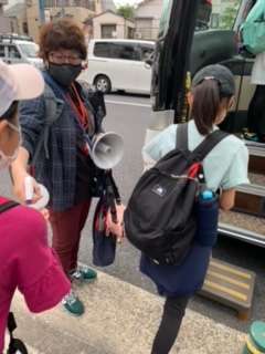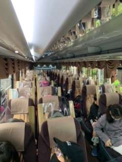 保護者の方、先生達のお見送りの中、笑顔で学校を出発。手指消毒をしてバスに乗り込みました。全席にアクリルボードが装着されています。7時45分出発しました。