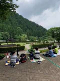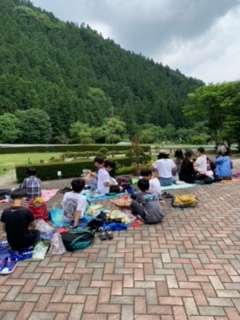 開室式が終わり、お弁当の時間となりました。おまつり広場で距離をとり、一方を向き、自然を楽しみながら食べています。