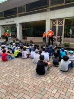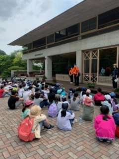 里山入門に出かけます。まずは、案内をしてくださる4人のスタッフの方からオリエンテーションがありました。これから2つのグループに分かれて1時間程宿舎周辺を探索します。