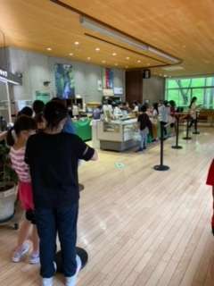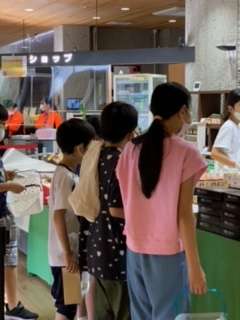 グループにより、時間をずらして入浴、お土産購入の時間を過ごしています。計算機を持ち、家族の顔も思い浮かべながらお土産を購入しています。りんごジュース、りんごチップ、キーフォルダー、ボールペンは人気の様子。どのようなお土産を持って帰るかお楽しみにしてください。