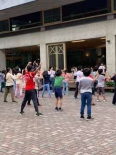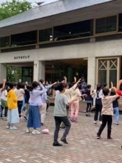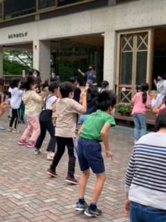 おまつり広場で、生活保健係司会による朝会です。みんなで元気に「エビカニクス」(音楽に合わせて朝の体操エクササイズ)をしました。眠気も吹っ飛びました。