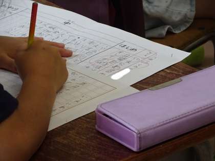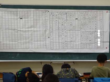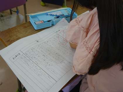 2年生の国語では、見つけたものや気付いたことをメモをして、「はじめ」「中」「おわり」の組み立てを考えて文章を書く学習をしています。同時に、丸、点、かぎ(人の話した言葉 会話)の書き方も学習していきます。