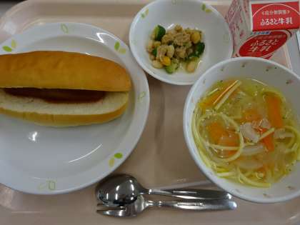 本日の献立 ウィンナーサンド 牛乳 ヌードルスープ ビーンズサラダ