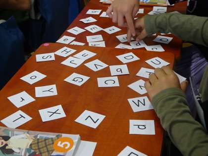 授業終了前の短時間を使って、アルファベットの大文字と小文字のカードを組み合わせ、いかにはやくペアのカードを組み合わせることができるか競い合いました。