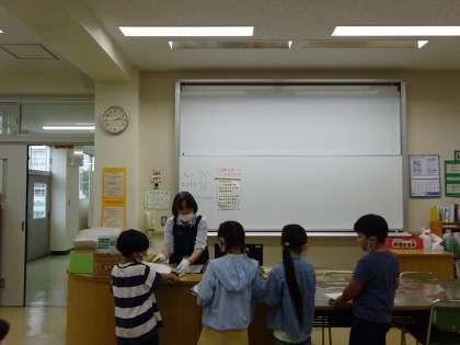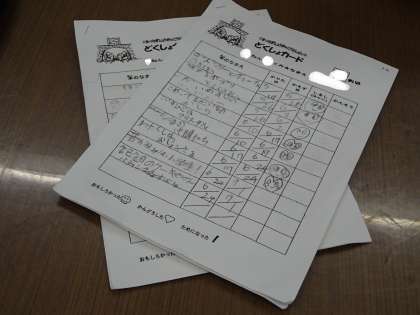 本が大好きな2年生です。図書の時間の初めには、学校図書館司書さんに読み聞かせもしていただきます。その後は、本の返却や読書。借りる本はカードに記録しています。