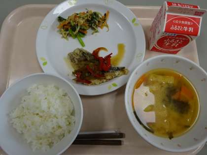 本日の献立 ごはん 牛乳 魚の南蛮漬け 野菜のごまあえ みそ汁