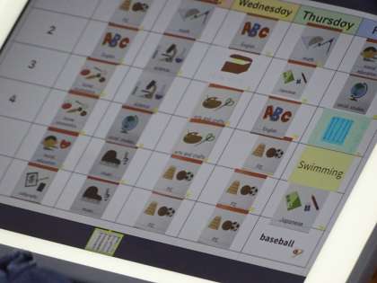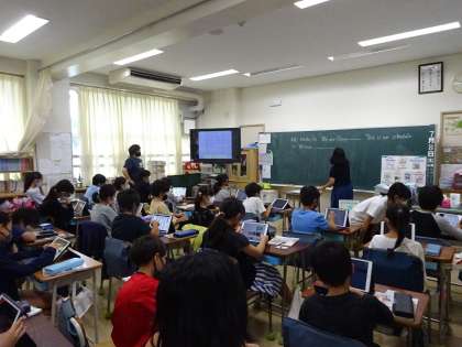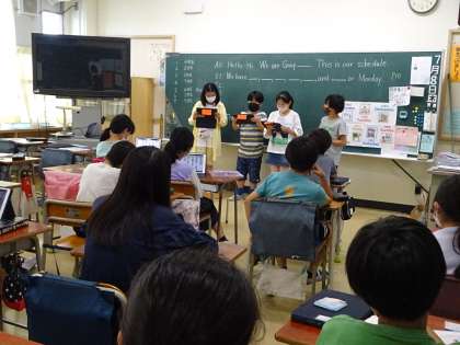 グループで作成した「時間割」を今日の表現を使って、全体の前で発表しました。時間割はiPadを活用して作成し、今日の表現を使って、グループで練習を積みました。どのグループも緊張しつつもしっかりと発表ができました。